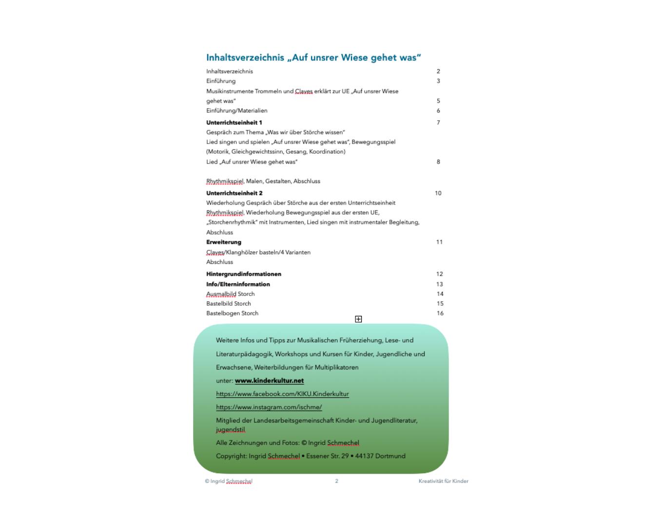 „Auf unsrer Wiese gehet was“ ist wieder ein Rundumpaket für die musikalische Früherziehung mit Übergängen zu anderen Bildungsbereichen: Bewegung, Rhythmik, Sprachförderung, Tanz, Malen, Basteln. Einsetzbar in der Kita, Grundschule oder Musikschule. Mit fertigen Mal- und Bastelvorlagen und Anleitungen zum Instrumentenbau.